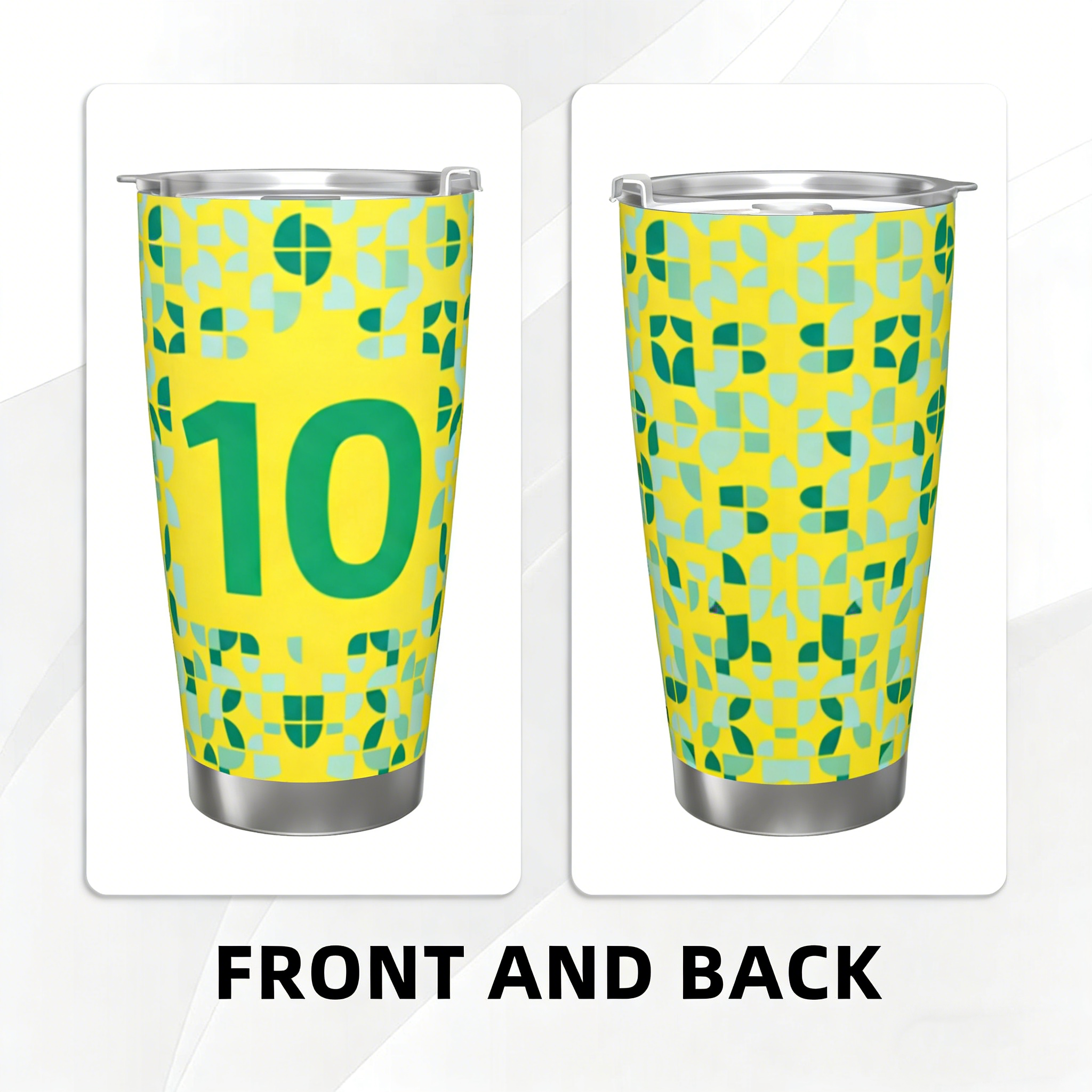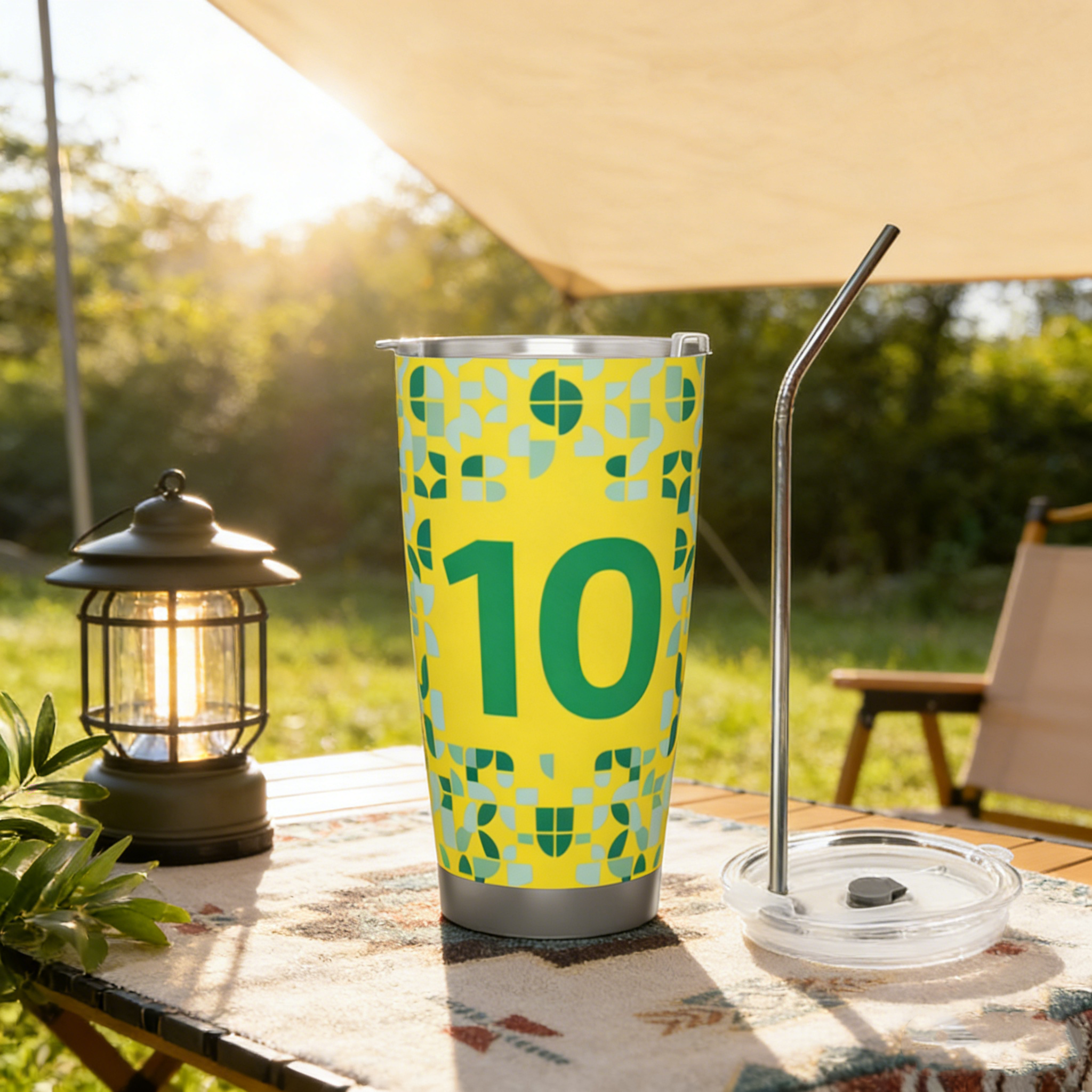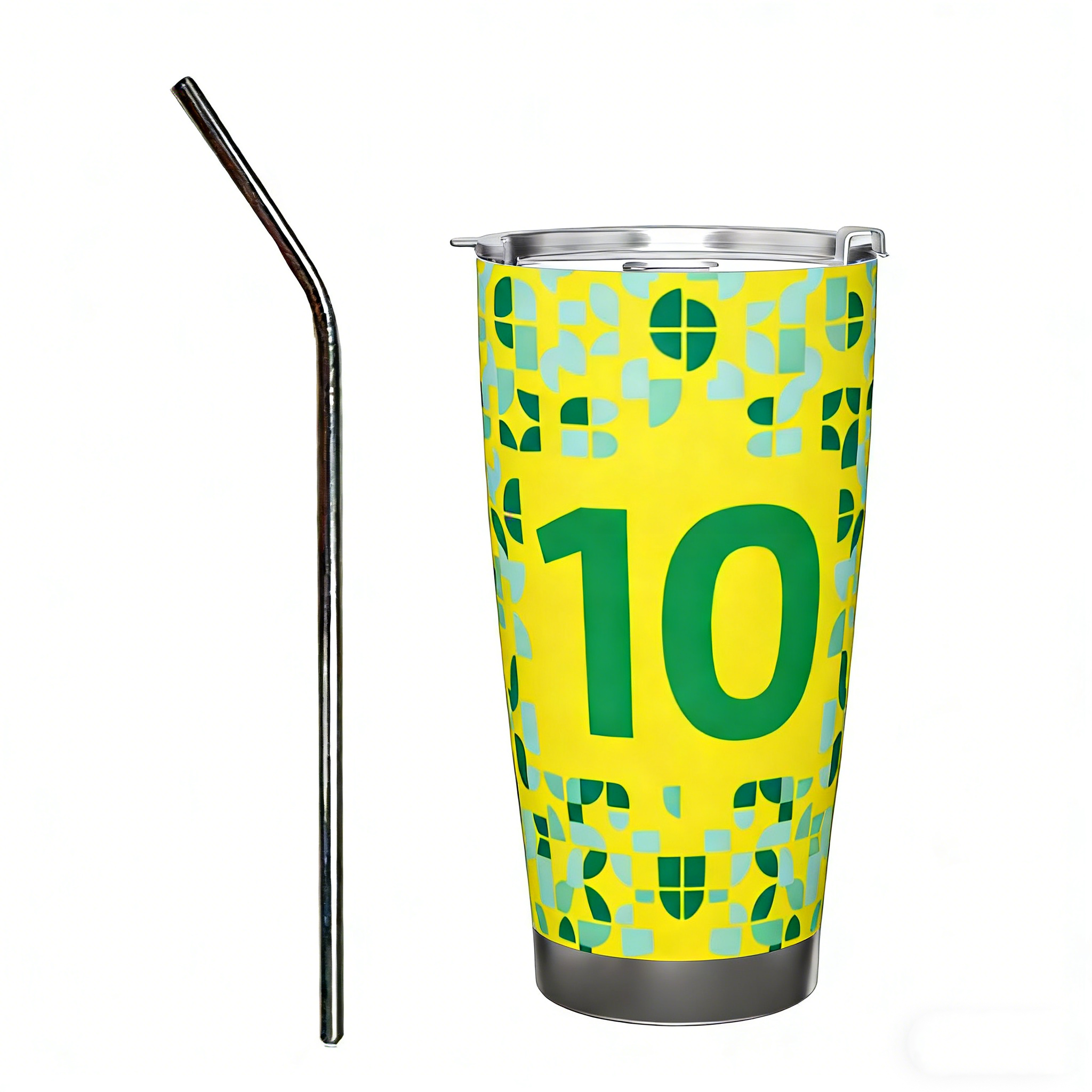 Brazil 10 Soccer Jersey Inspired Insulated Tumbler, Vibrant Yellow & Green Geometric Mosaic Design Premium 18/8 Food-Grade Stainless Steel Vacuum Insulated Travel Coffee Mug with Stainless Steel Straw & Sealed Lid, Double Walled Reusable Cup for Hot & Cold Beverages, Ideal Gift for Soccer Lovers & Brazil Football Supporters |